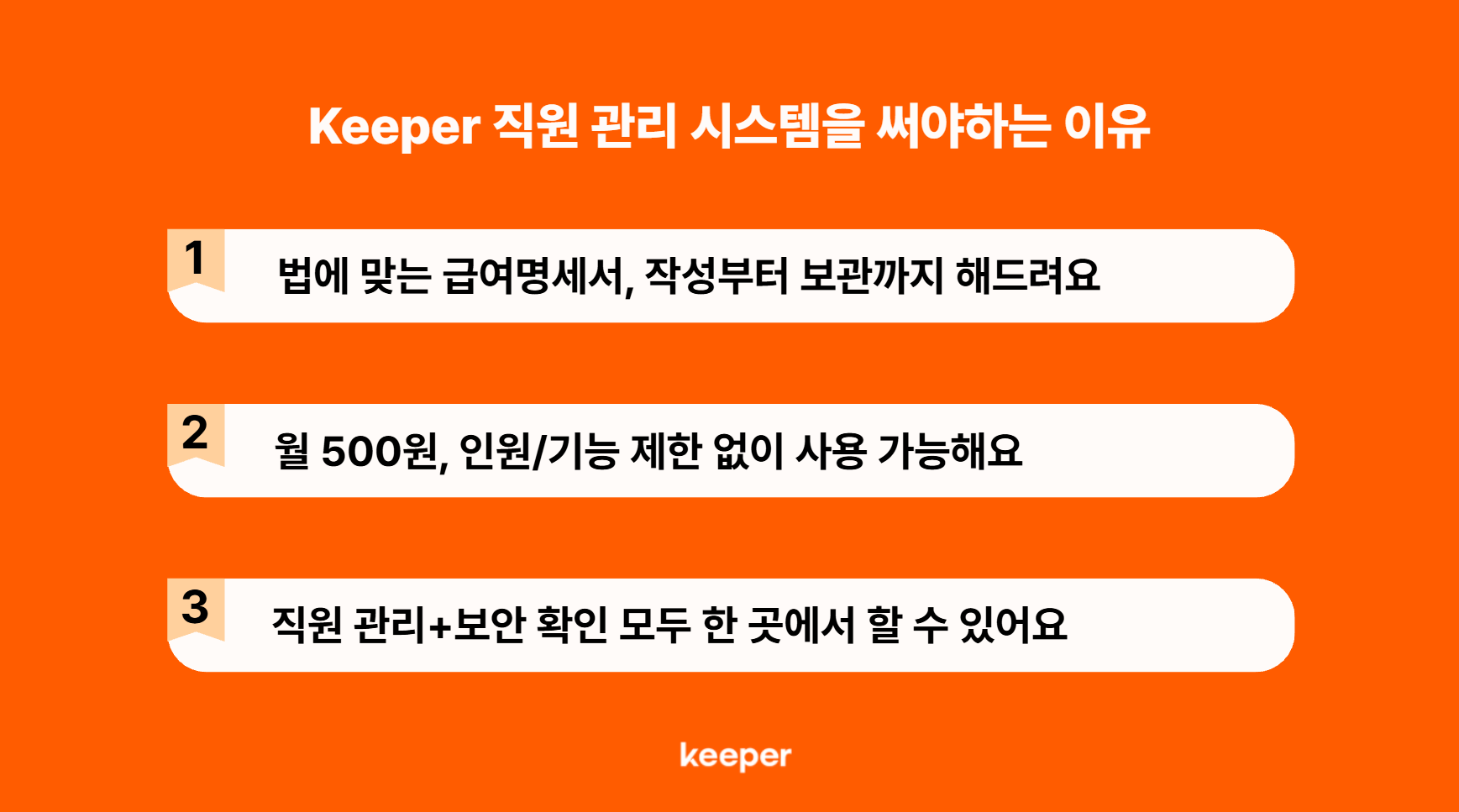 먼저 가격 면에서 보자면, 타사는 직원 수에 따라 요금이 올라가는 종량제인 경우가 많은데 Keeper는 직원이 몇 명이든 월 500원 정액제입니다.