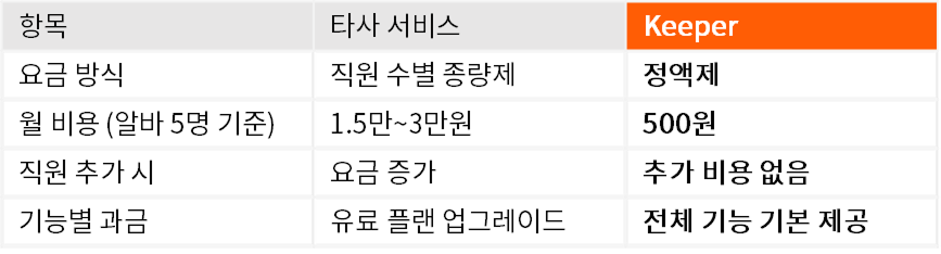 타사 직원관리 서비스는 직원 수에 따라 요금이 증가하지만, Keeper는 매장당 월 500원의 정액제로 부담이 없습니다. 알바 5명이든 10명이든 추가 비용 없이 동일한 기능을 이용할 수 있으며, 기능별 추가 과금 없이 제공돼요.