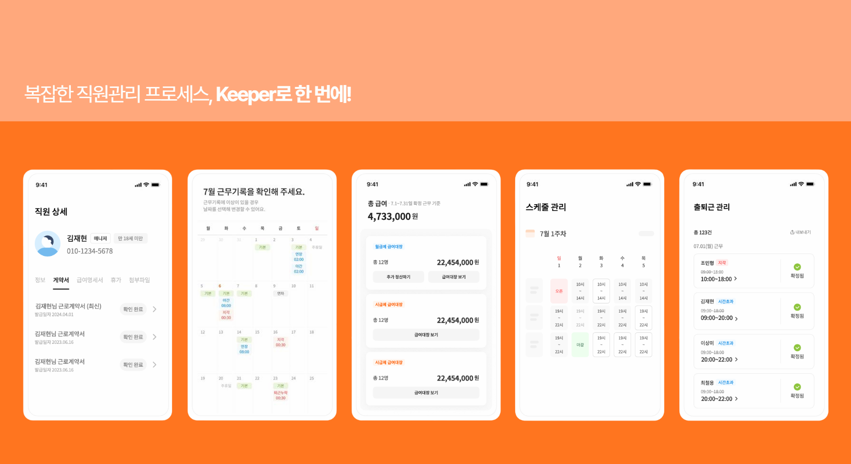 Keeper는 매달 반복되는 출퇴근 기록 확인부터 복잡한 수당 계산, 급여명세서 작성(오픈 예정)과 발송까지 모든 과정을 도와드립니다. 사장님이 직접 처리하던 작업이 클릭 몇 번으로 끝나니, 절약된 시간을 매장 운영에만 투자할 수 있죠.