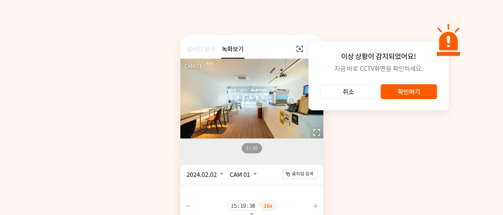 사장님 또는 매장 운영자가 항상 현장에 있기 어려울 수 있습니다. 원격으로 근무하더라도 언제 어디서든 매장의 현황을 파악하는 것이 중요한데요. 하지만 CCTV를 계속해서 주시하기는 현실적으로 어렵기 때문에, 움직임이 일어나거나 의심스러운 활동에 대해 즉시 알림을 받고, 이상 징후에 대처할 수 있도록 시스템화하는 것이 중요합니다. 실시간 모니터링 기능은 카메라 시야 범위 내의 움직임을 감지해 스마트폰 앱 등을 통해 경고 알람을 줄 수 있습니다. 매장을 주의 깊게 살피지 못할 때도 알람을 통해 사고가 일어나기 전 빠른 대처가 가능하죠. 또한 특정 얼굴 인식, 자연물, 동물 등 지정된 사람과 사물의 움직임을 정확하게 구분하는 기능이 있다면 불필요한 알람을 줄이고 보안의 정확성을 높일 수도 있습니다.