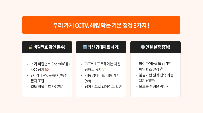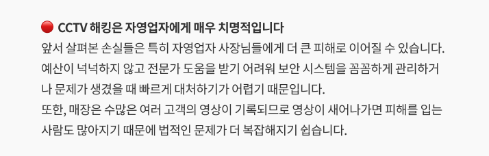 매장 CCTV 영상이 해킹되어 온라인에 유출되는 사건을 뉴스에서 종종 접하게 됩니다. 실제로 많은 국내 CCTV가 해킹 위협에 취약한 상태인데요. CCTV 해킹은 단순한 사생활 침해 문제를 넘어, 고객 정보나 영업 기밀 유출, 가게 이미지 손상 등 사업 운영에 직접적 피해를 줄 수 있는 심각한 문제입니다.