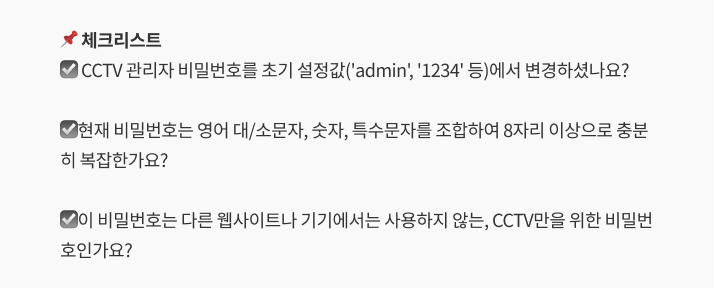 CCTV 해킹의 심각한 위험성을 알아봤는데요. 다행히 많은 해킹은 기본적인 보안 규칙을 지키는 것만으로도 막을 수 있다고 합니다. 어떤 점들을 주의해야 할지, 해커들이 노리는 흔한 보안 약점을 중심으로 직접 점검해 보실 수 있도록 지금부터 하나씩 알아보겠습니다.