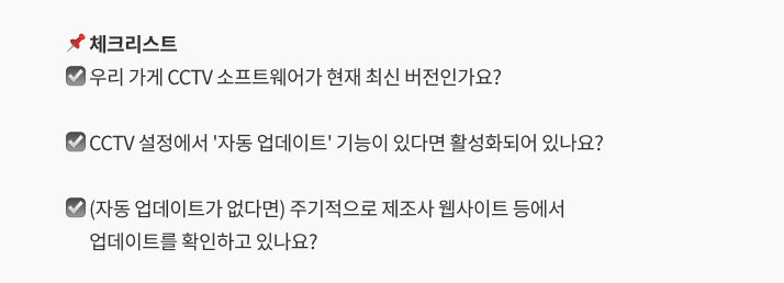 CCTV 제조사들은 발견된 보안 허점을 막거나 기능을 개선하기 위해 정기적으로 소프트웨어 업데이트를 제공합니다. 하지만 이를 번거롭게 여기거나 잘 몰라서 지나치면, 오래된 소프트웨어의 약점 때문에 해킹을 당할 수 있습니다. 따라서 보안을 위해서는 항상 최신 상태를 유지하는 것이 매우 중요합니다.