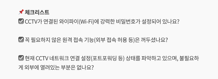 따라서 CCTV가 연결된 인터넷 공유기(Wi-Fi)에는 반드시 짐작하기 어려운 강력한 비밀번호를 설정하고, 안전한 최신 보안 방식을 사용하는 것이 중요합니다. 또한, 외부에서 CCTV를 실시간으로 확인할 필요가 없다면 원격 접속 관련 기능은 꺼두는 것이 가장 안전합니다. 꼭 필요한 경우가 아니라면, 잘 모르는 네트워크 설정이나 연결 기능은 함부로 열어두지 않는 것이 기본 보안 규칙입니다.
