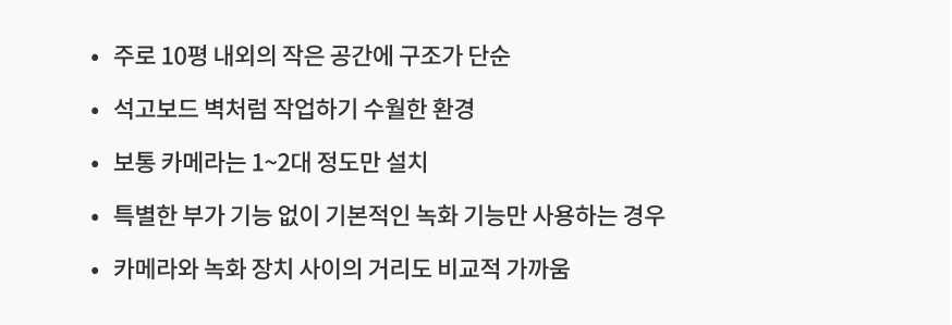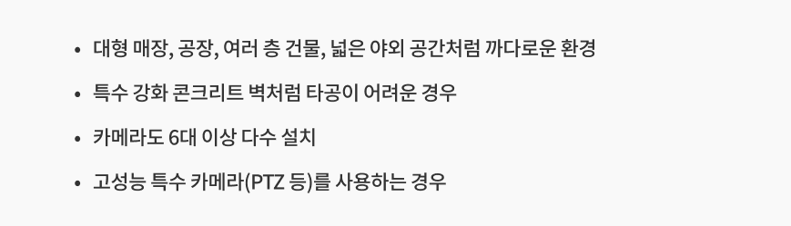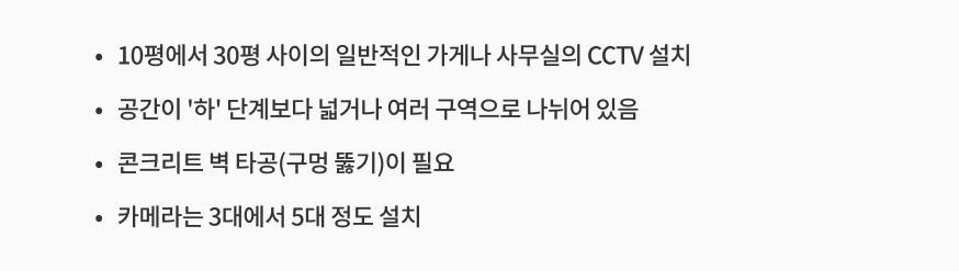 또한 부가 기능 설정 역시 여러 시스템(POS, 출입 통제 등)과 연동하거나 여러 지점을 통합 관리하는 등 전문적인 기술이 필요할 때가 많습니다. 따라서 상당한 시간과 전문 장비, 숙련된 기술이 필수이며 설치 비용도 가장 높게 책정됩니다.