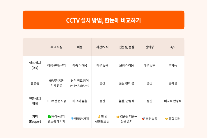 복잡한 고민 없이 투명한 비용으로 믿을 수 있는 CCTV 설치를 원하신다면, 키퍼가 좋은 선택이 될 수 있습니다. 지금 바로 키퍼 전문가 상담을 받아 보세요!