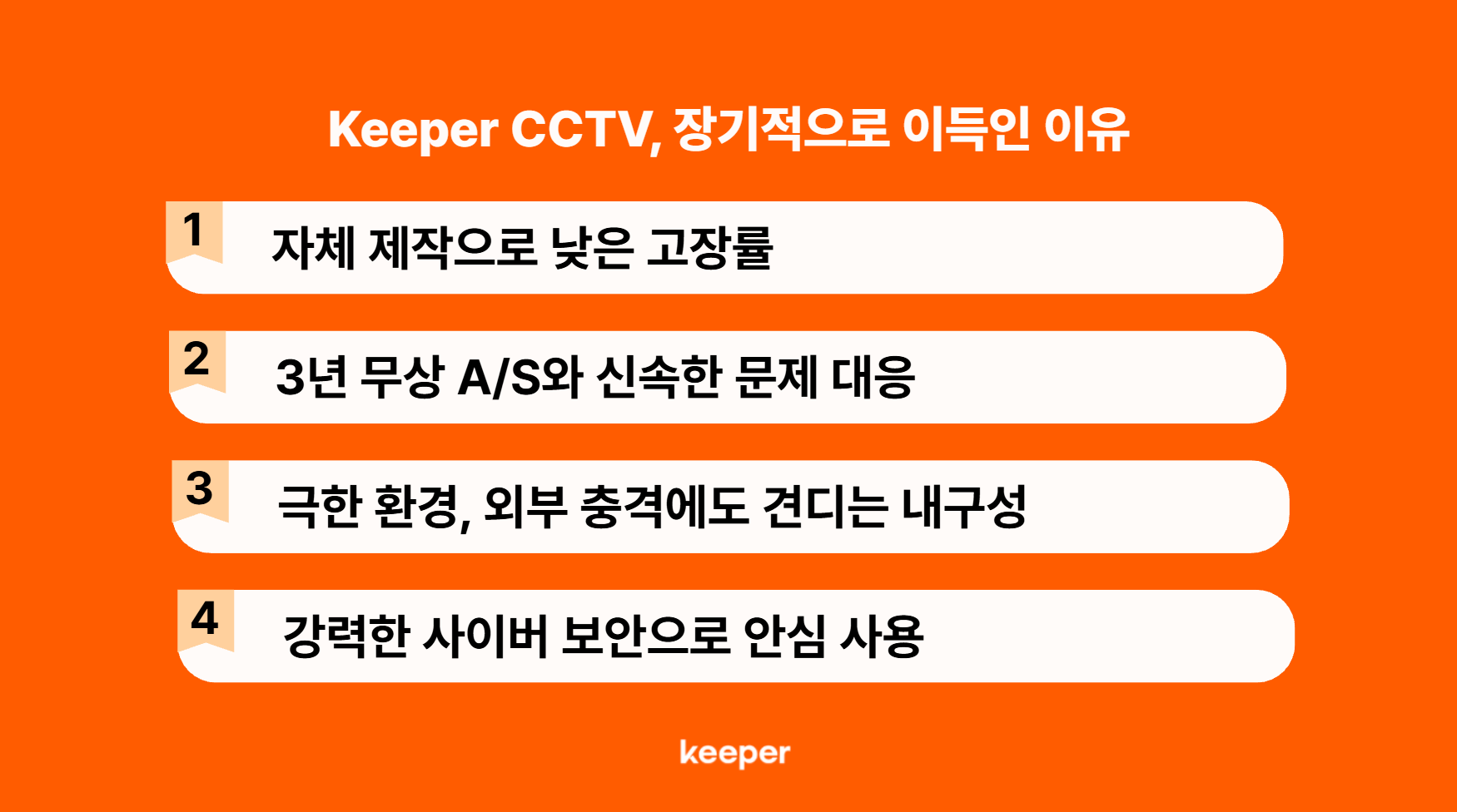 3년 간의 TCO를 비교하면, 초기 비용이 높았던 Keeper의 총 비용이 장기적으로는 오히려 저가 CCTV보다 낮아지는 것을 확실히 볼 수 있습니다. 여기에 수리 대기 시간, 보안 사고 시 발생하는 피해, 관리 스트레스 같이 수치로 정확하게 환산하기 어려운 비용까지 고려하면 그 차이는 더욱 커지고요.