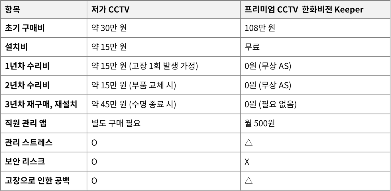 바로 이런 이유로 많은 사장님들이 선택하는 솔루션이 있는데요, 30년 기술력을 자랑하는 한화비전 Keeper입니다. Keeper가 장기적으로 훨씬 경제적인 선택이 되는 이유를 지금부터 알려드릴게요.
