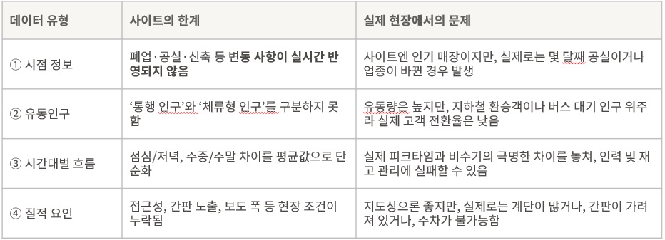 최근에는 폐업 점포가 여전히 영업 중으로 표시되거나, 매출 추정치가 과도하게 노출되어 점주와의 갈등이 생긴 사례도 있었죠. 이처럼 상권 분석 사이트의 데이터는 ‘참고용’이지, ‘판단의 전부’가 되어서는 안 됩니다.